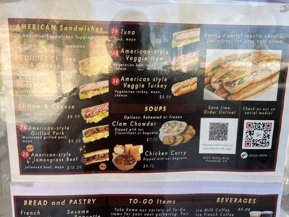 Introducing "Mr Baguette", located in Rosemead, CA, offering a wide range of menu options. From soups like the flavorful Chicken Curry and classic Clam Chowder to mouth-watering sandwiches such as the popular Grilled Beef and Grilled Chicken, every dish is prepared with perfection. Customers rave about the tasty sandwiches and fast service, with options for vegan and vegetarian diets. The restaurant also offers a variety of amenities including delivery, takeout, and catering services. The ambiance is casual and welcoming, perfect for groups or lunch outings. With delicious food, friendly service, and a clean environment, "Mr Baguette" is a must-try dining destination.